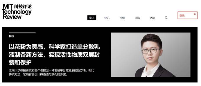近期,《麻省理工科技评论》(MIT Technology Review China)对我院青年教师蒋航进行了专题采访,并以封面形式发表于中国官方网站及公众号。该采访的主题为“以花粉为灵感,科学家打造单分散乳液制备新方法,实现活性物质双层封装和保护”,重点报道了蒋航老师近期在单分散Pickering乳液制备方面的最新研究成果及未来研究设想。
