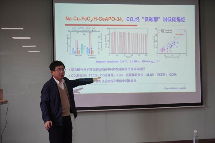 樊卫斌研究员的报告主要基于面向“双碳”背景下的国家能源重大战略需求出发,介绍了其团队在相比传统“费托合成路线”选择性更有优势的CO2转化经“甲醇中间体路线”制烃方面所做的系统性、引领性工作。报告通过设计金属氧化物/分子筛复合催化体系,定向调控金属氧化物表界面电子/几何结构、组成以及分子筛孔道结构、微观形貌和酸性特征等,实现了对CO2加氢制烃选择性的有效控制,阐明了催化反应机理,提出了新的反应路径,为研发CO2高选择性制燃料和化学品催化剂提供了理论支撑。