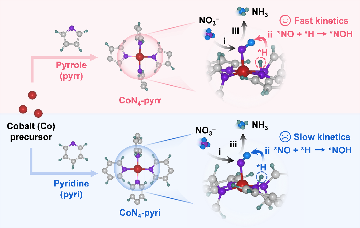 针对硝酸盐电还原反应中氢自由基(*H)转移/耦合动力学慢的问题,我们开发了一种富含金属单原子活性位点的共轭配位聚合物催化剂,并通过配体设计实现了金属单原子活性位点上*H转移/耦合动力学的提升,进而提高硝酸盐电还原制氨反应活性和选择性。本工作以钴金属单原子为例,使用吡咯(pyrrole)和吡啶(pyridine)配体制备得到两种共轭配位聚合物催化剂(分别命名为CoN4-pyrr和CoN4-pyri),并系统研究了氮杂环配体结构对钴金属单原子的硝酸盐电还原制氨反应过程的影响机制。电化学性能测试结果表明:与CoN4-pyri催化剂相比,CoN4-pyrr催化剂表现出更高的硝酸盐电还原制氨反应活性和选择性(法拉第效率为99.5%,电流密度为380.3 mA cm-2,氨产率为1.93 mmol h−1cm−2)。结合实验和理论研究结果发现,与CoN4-pyri催化剂中吡啶配体的氮原子相比,CoN4-pyrr催化剂中吡咯配体的氮原子可显著加速*H转移,并促进了其与钴金属单原子活性位点上*NO中间体的耦合,最终实现了硝酸盐电还原制氨性能的提升。