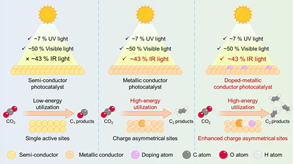 图2:具有电荷不对称双活性位点的导体催化剂上红外光催化CO2还原制C2产物的示意图