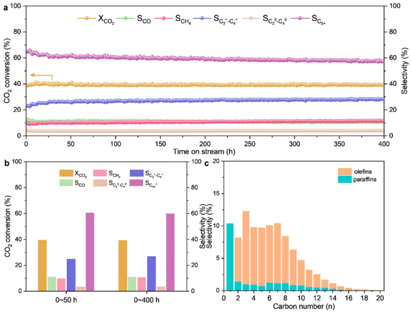 图2.Fe3Zn1-U-12Cu催化剂400 h稳定性测试结果及产物的选择性和平均碳数分布。