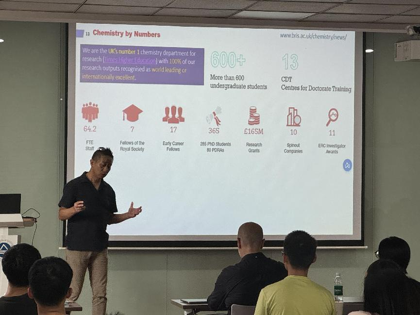 Charl F. J. Faul和Wuge Briscoe首先介绍了布里斯托大学及其化学学院的整体情况,包括布里斯托市的人文历史、布里斯托大学的办学成效、化学学院的学科排名和研究方向等;然后对太阳集团2007-布里斯托本硕一体化联合培养项目、学者互访交流,以及布里斯托大学对我校留学生在住宿、生活和学习等方面的支持及相关政策向我院师生做了详细介绍。